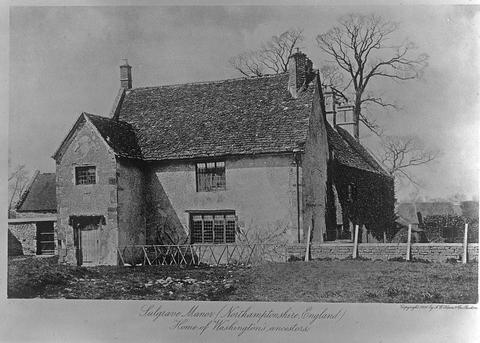 A black and white photograph of a depiction of Sulgrave Manor, home to Washington's ancestors.