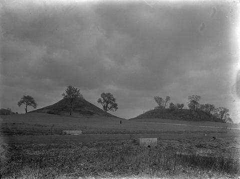 A black and white photograph taken of the Cahokia Mounds State Historic Site.