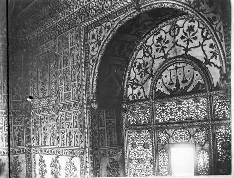 A black and white photograph of an doorway engraved in ornate carvings, which was taken be Jesse Lowe Smith while in India.