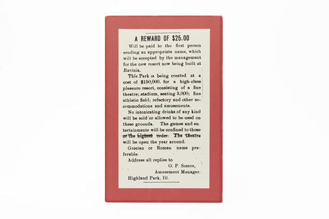 Framed broadside advertising :A REWARD OF $25.00 Will be paid to tbe first person sending an appropriate name, which will be accepted by the management for the new resort now being built at Ravinia.