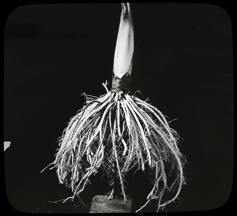 Hand-colored photograph of speciman skunk cabbage and its root system.