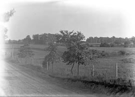 A view of the Lincoln farm. The road tablet at the boundary of the farm is seen; also the cabin glimpsed in the middle background; distant view showing one of the brick pillars marking beginning of Lincoln farm; a portion of the farm, sink holes, etc.; log cottage embowered in the trees, etc.; 1911/08/07; time of day: 5:30 PM