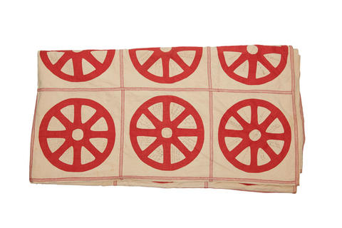 Pieced by the Woman's Missionary Society of the first Evangelical Congregational Church. This 1895 block quilt of wagon wheels is an early example community fundraising in Highland Park, Illinois. It contains 564 names. A wheel's center name is probably the church or missionary member sewing that section with the names in the spokes being subscribers to her wheel. 192 x 190 cm.