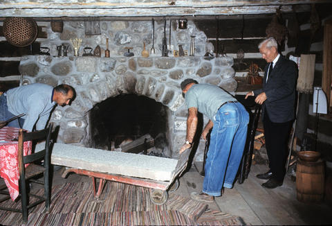 Bob Robinson inspects the re-installation of the Cabin fireplace and chimney.